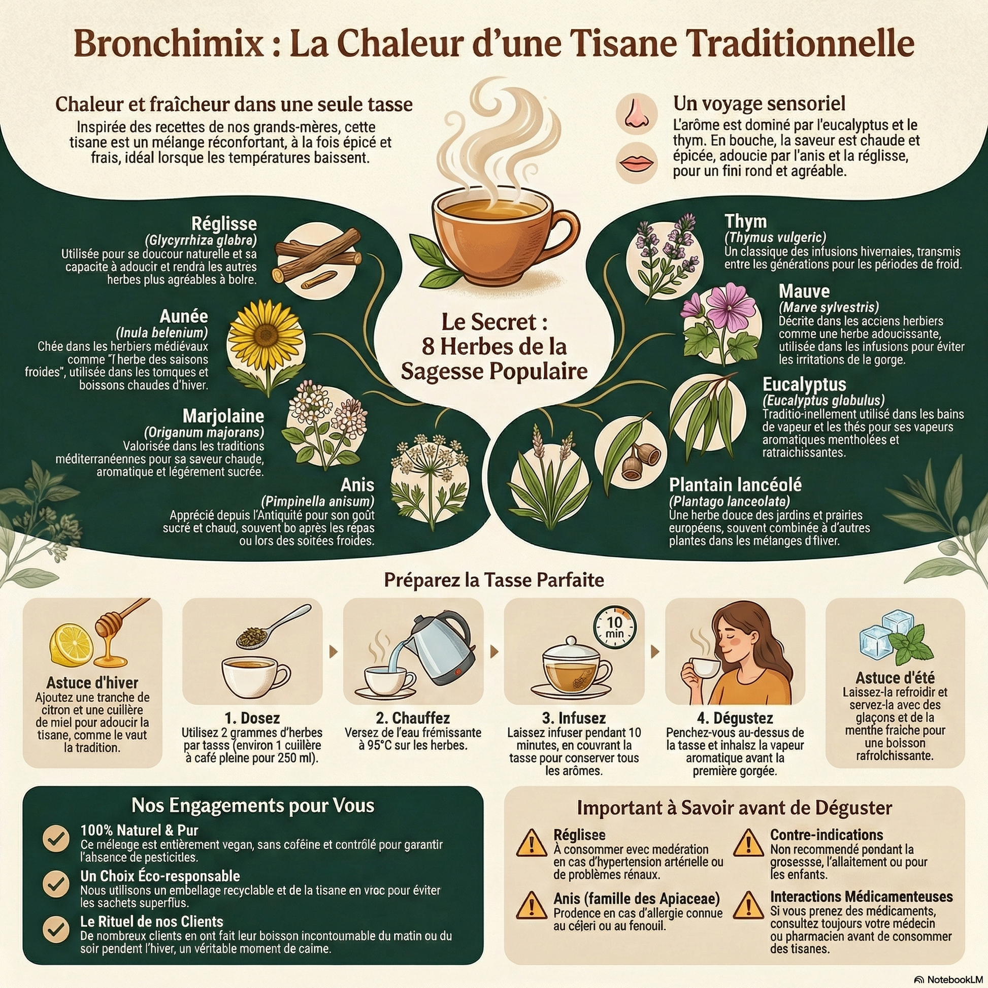 Nog voor je eerste slok stijgt de aromatische damp op eucalyptus, tijm, een vleugje anijs. De smaak opent verwarmend en kruidig met tijm en marjolein. Dan volgt de verkoelende sensatie van eucalyptus met zijn heldere, mentholachtige frisheid die je zintuigen prikkelt. Anijs en zoethout brengen zachte zoetheid, terwijl kaasjeskruid en weegbree alles heerlijk rond maken. Elecampane geeft een aardse, volle basis.