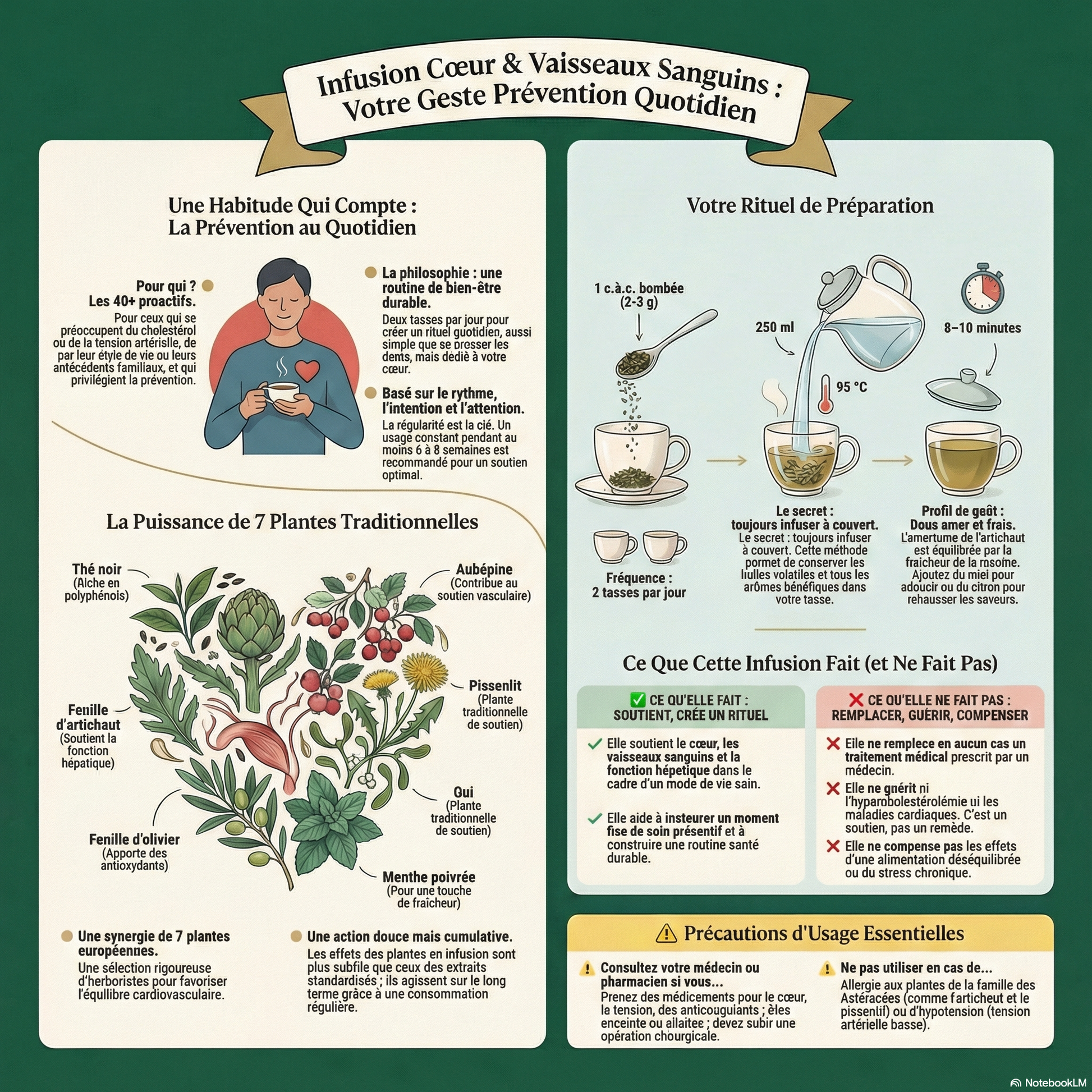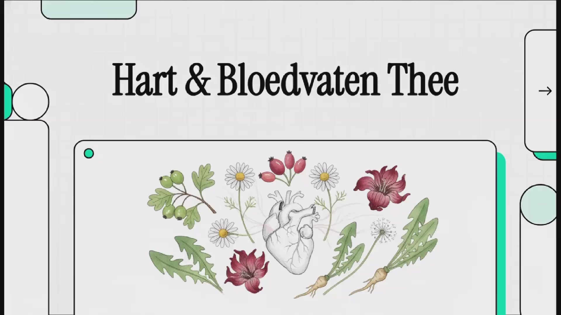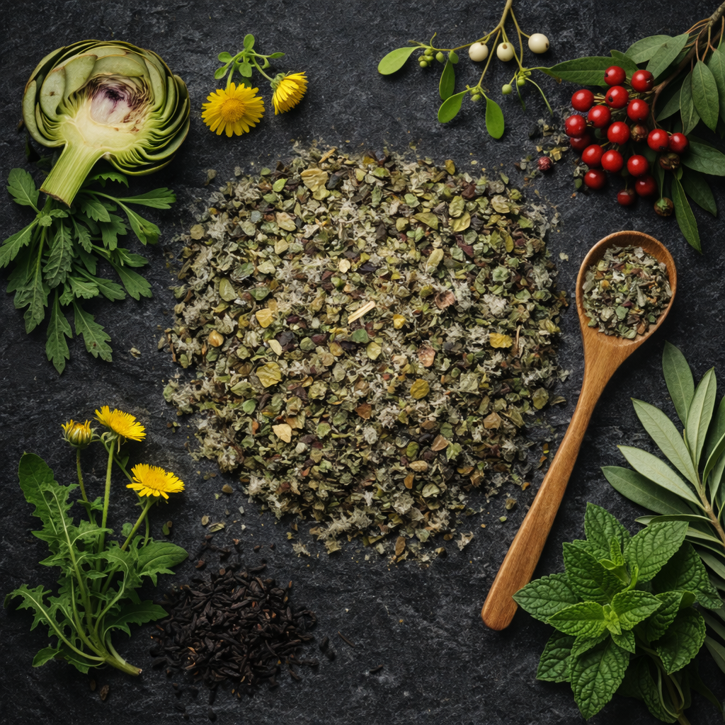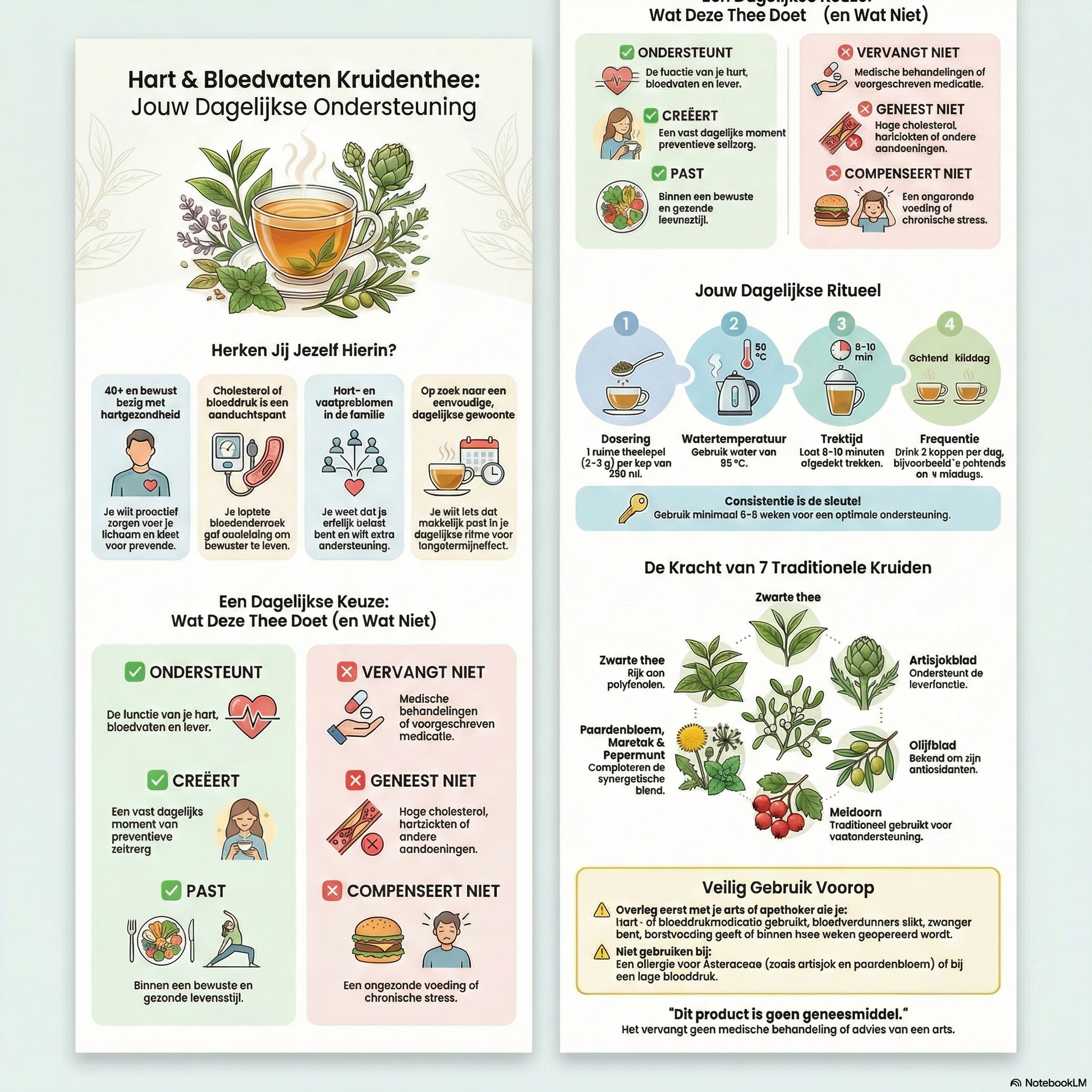 Deze blend combineert zeven traditionele Europese kruiden die al eeuwenlang gebruikt worden voor cardiovasculair evenwicht: artisjok voor leverfunctie, olijfblad voor antioxidanten, meidoorn voor vaatondersteuning, zwarte thee voor polyfenolen, plus paardenbloem, maretak en pepermunt.